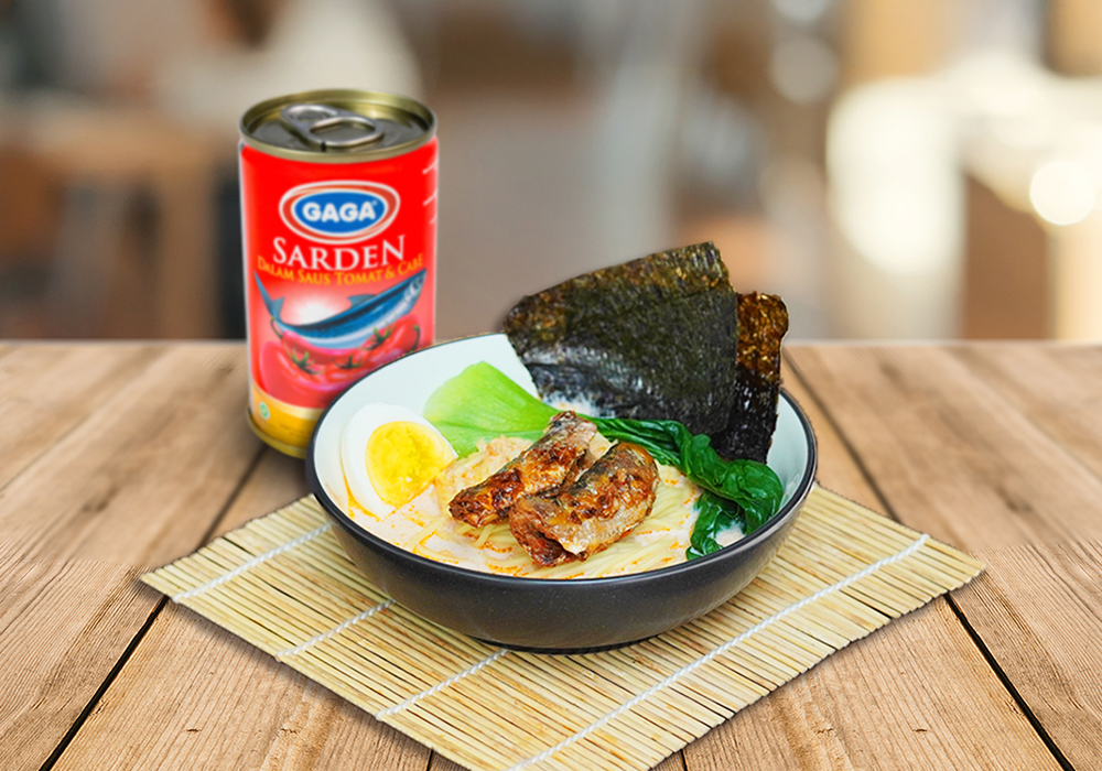 7. Masukkan mie ke dalam mangkuk, siram dengan kuah sarden susu.
